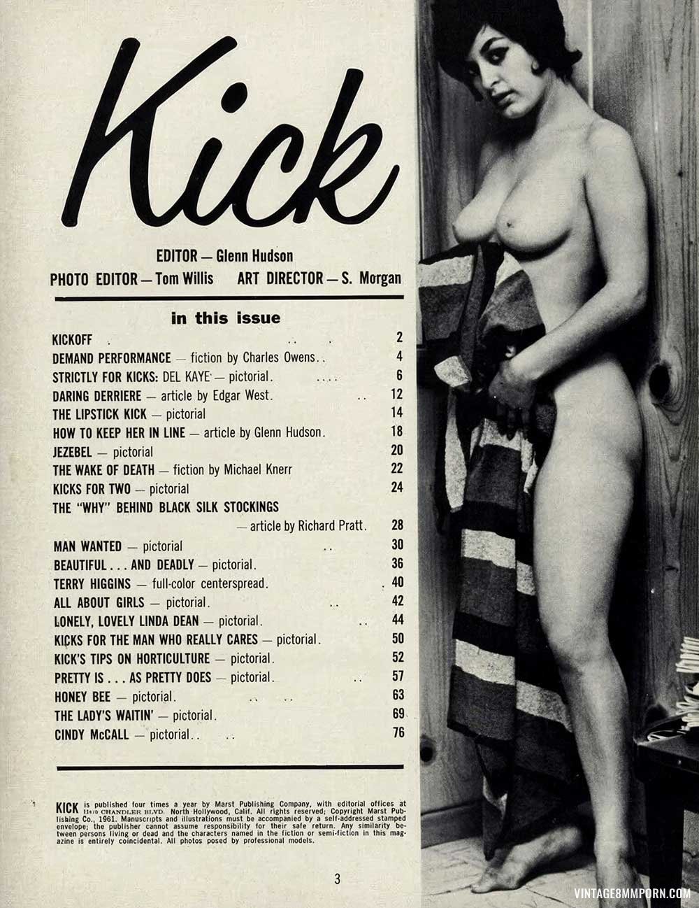 HOW TO KEEP HER IN LINE! TERRY HIGGINS IN FULL COLOR! ADULTS ONLY! Kick VOL. 1 NO. 1, A MAGAZINE FOR MASTERFUL MEN! COLLECTORS ISSUE! With Terri Higgins, Honey Bee! Incomplete.
